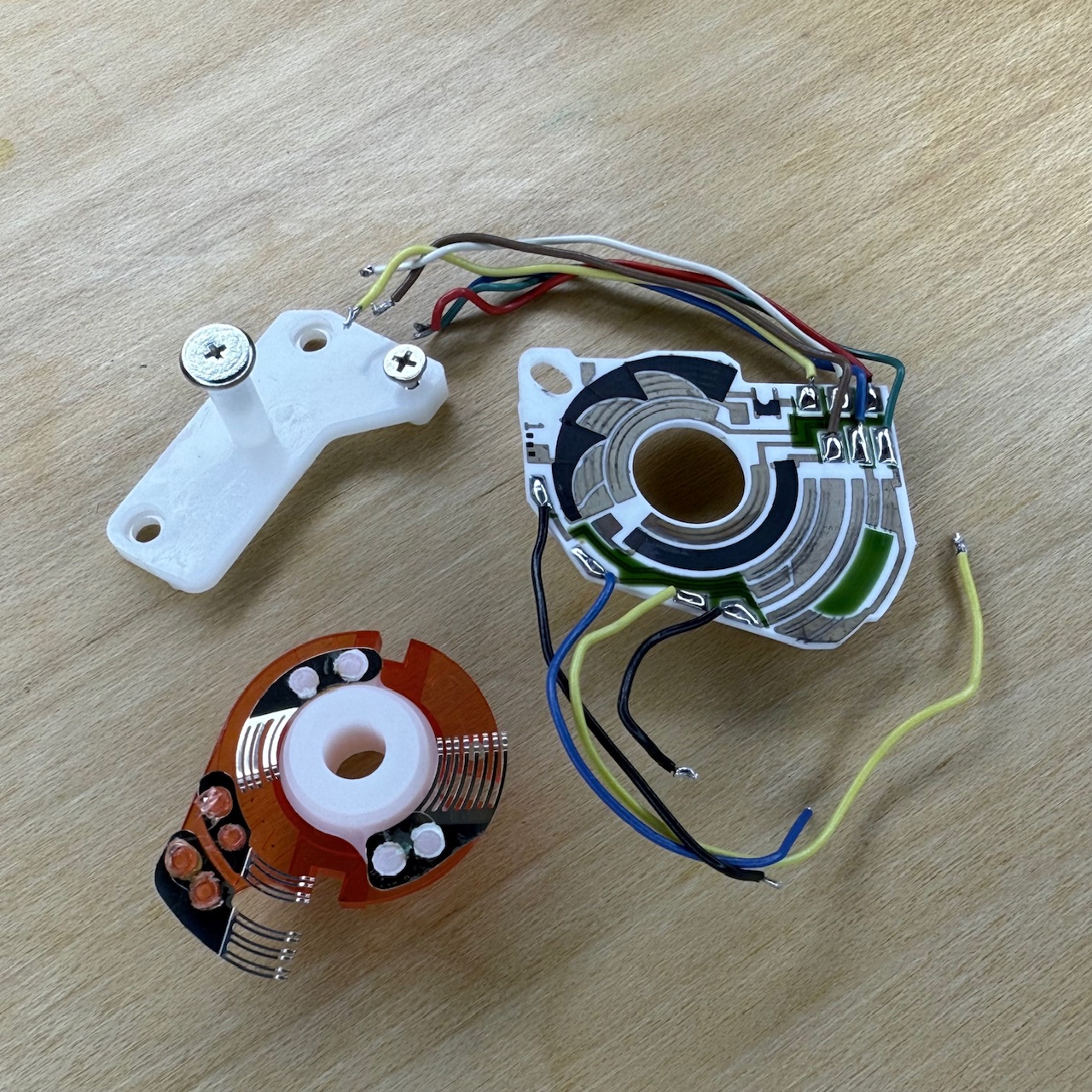 These are the parts for the underside of the ISO/ASA selector and mode switch. The PCB has been unsoldered with all wires left intact and uncut. The selector spindle (red) has all contacts/pawls present and none are bent or overly worn. A bracket for securing the PCB to the body is present, with fixings (not body fixings as these also hold the main ribbon PCB in place)