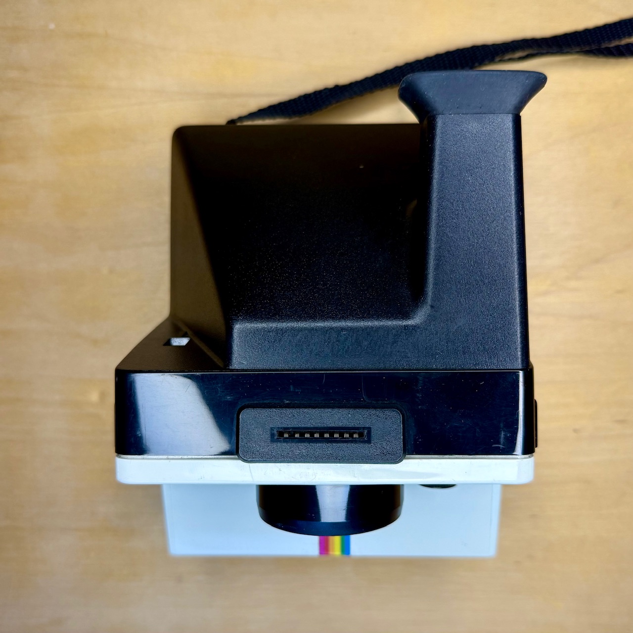 This description wasn’t written by with AI, but I love this camera from my personal collection so much that it might sound like some jerky AI spiel after I’m done. This camera is an icon. When someone says “Polaroid camera” most people over about 35 get an image of a cream boxy camera with a rainbow stripe on it. If you remember Instagram for the first half decade of its miserable continuing existence, then you remember App icons showing a square camera with a rainbow stripe on it. This is that camera. Even the typeface used for the 1000’s model number, and the product name on the optional Polatronic flash, look as near as damnit to a perfectly 70’s sci-fi font that you will know called ‘Data 70’ by Bob Newman.